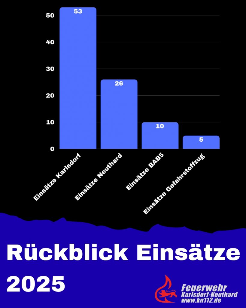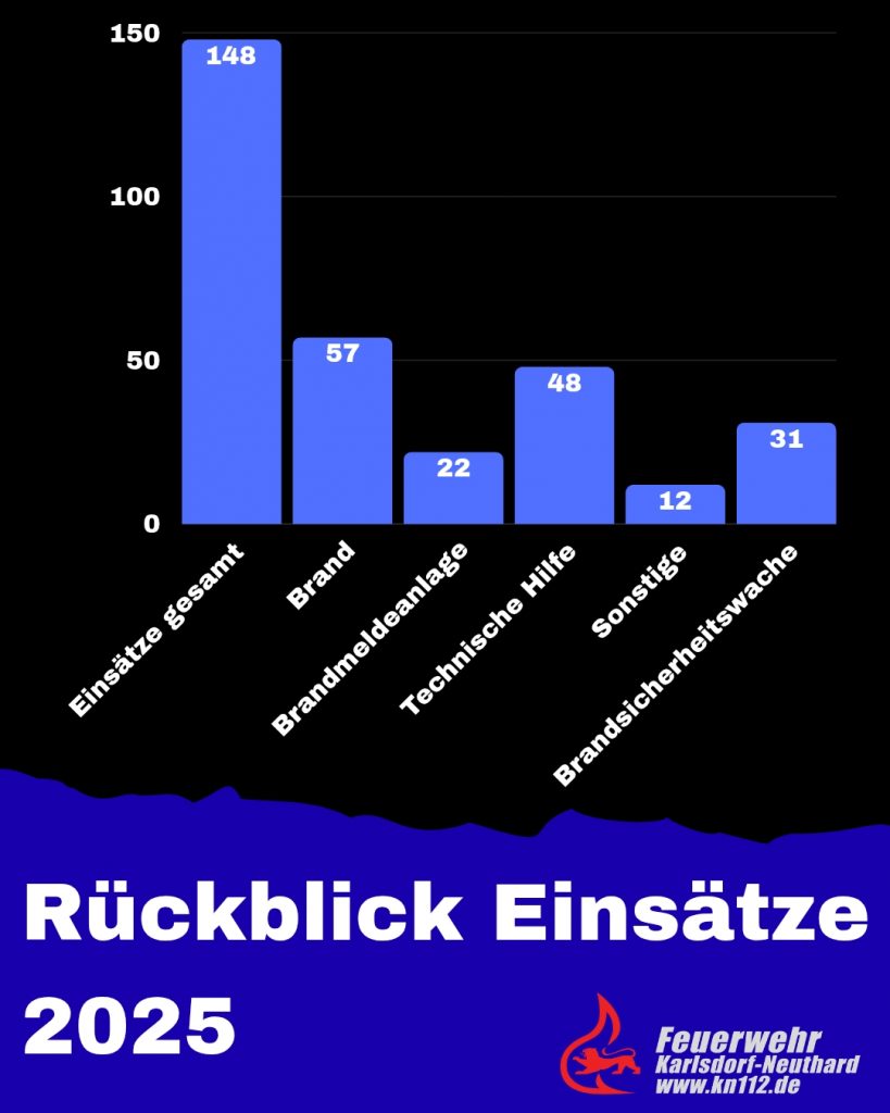 Das Jahr 2025 war für die Freiwillige Feuerwehr Karlsdorf-Neuthard erneut von vielen Einsätzen geprägt. Insgesamt wurden wir zu 148 Einsätzen alarmiert.