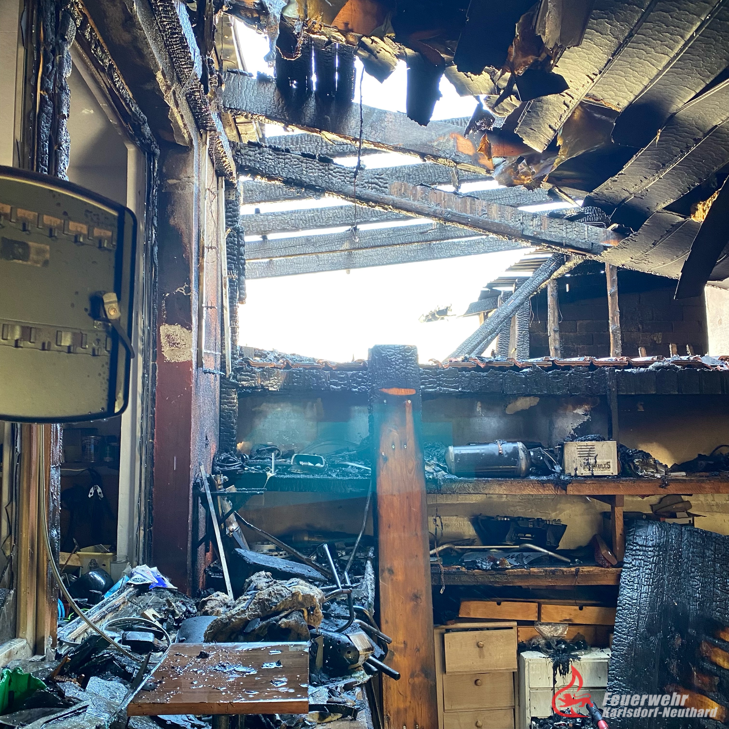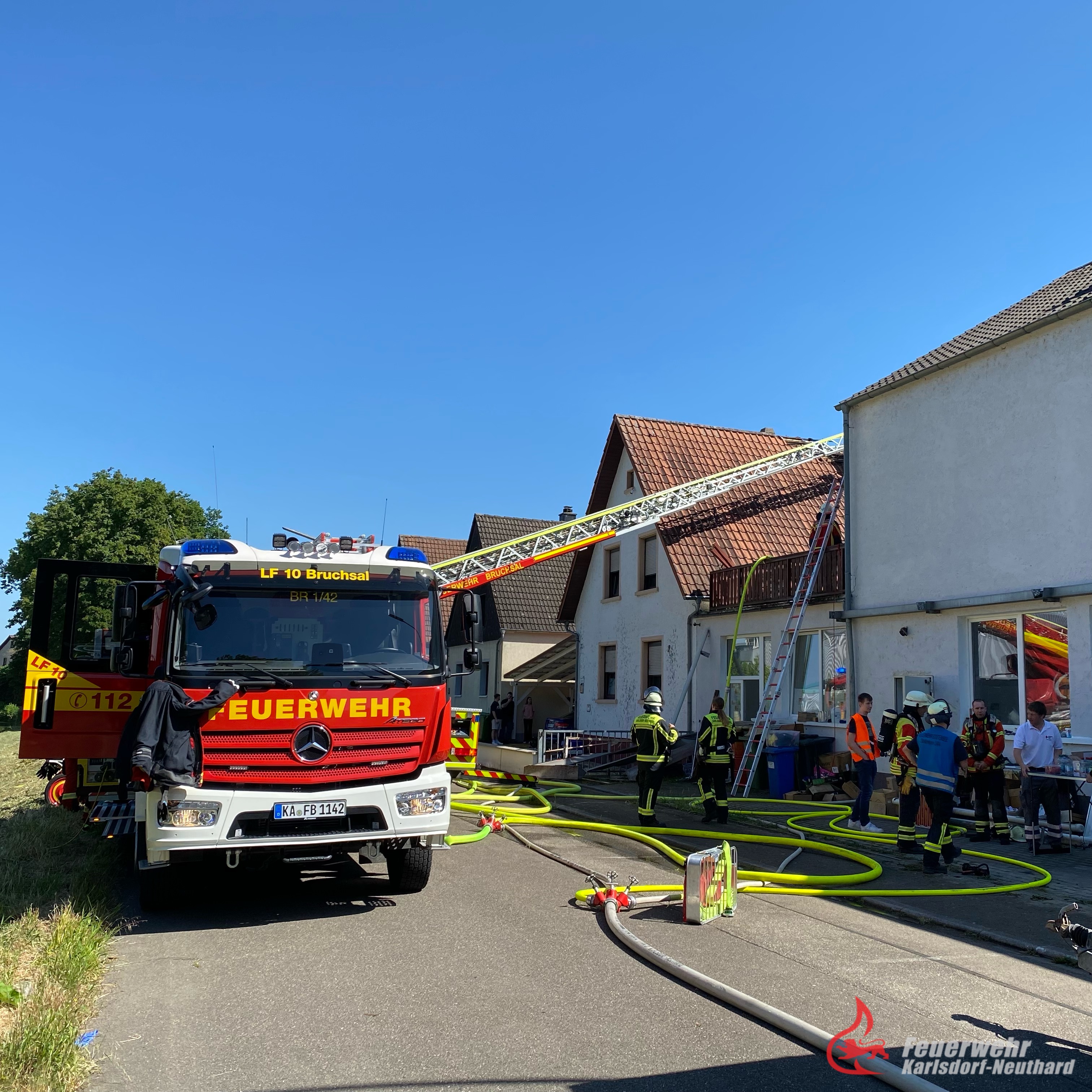 Am frühen Mittwochnachmittag, des 31.05.23 wurde die Feuerwehr Karlsdorf-Neuthard mit der Alarmstufe B4 zu einem Dachstuhlbrand nach Karlsdorf alarmiert. Bereits auf der Anfahrt wies eine dunkle Rauchwolke den Einsatzkräften den Weg zum Brandobjekt. Der Brand, vermutlich ausgehend von einer Scheune/Garage, drohte auf das Wohnhaus und eine angrenzende Werkstatt überzugreifen.