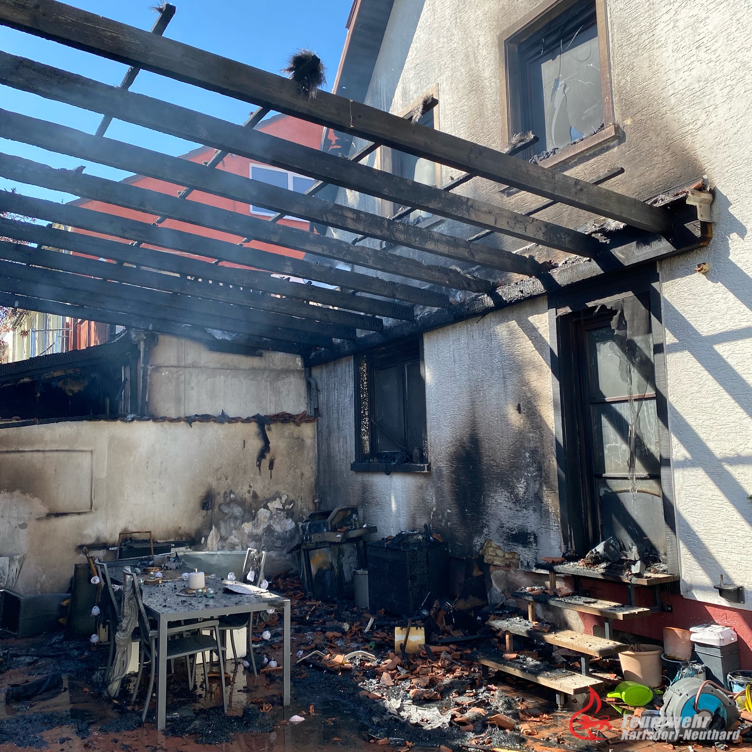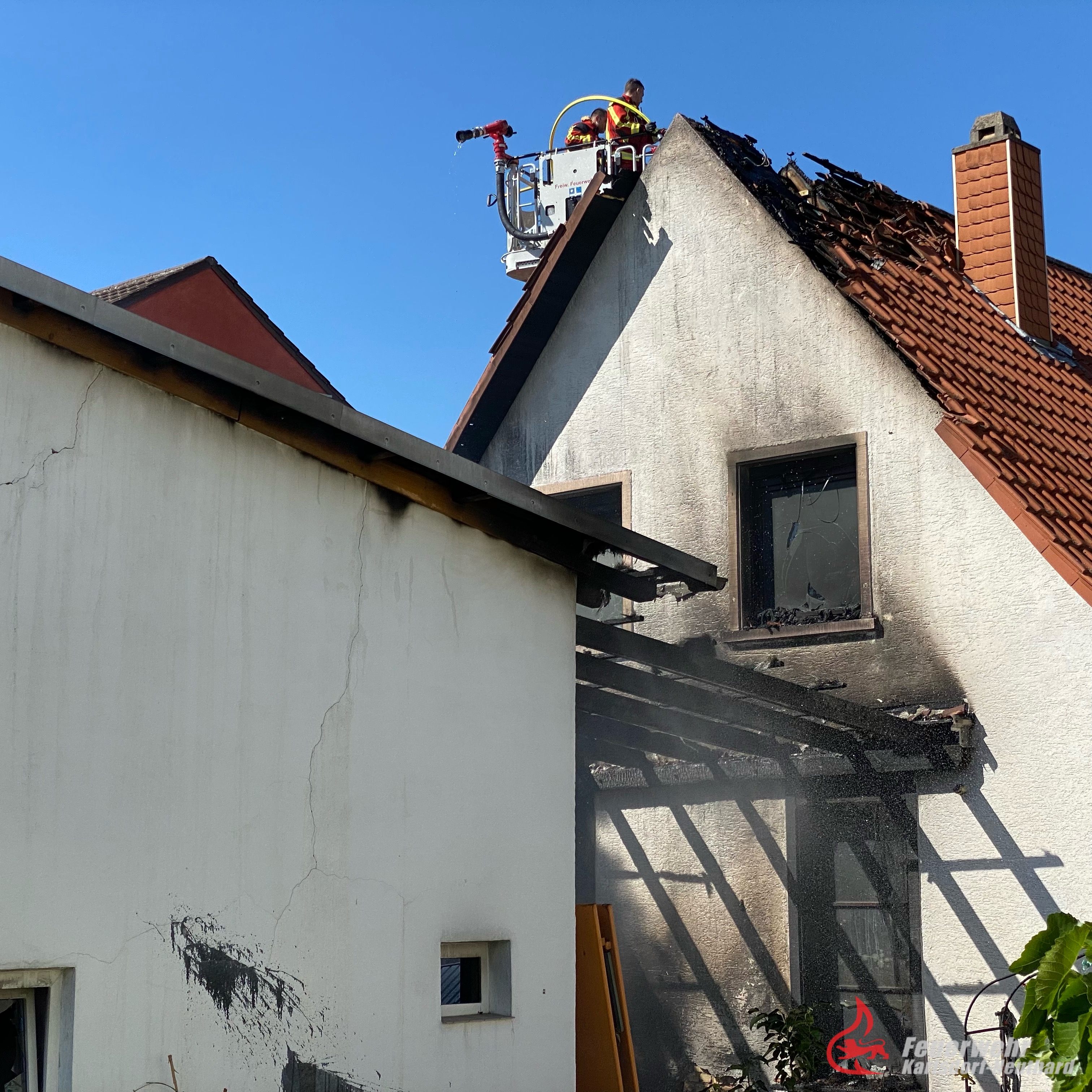 Da der Brand bereits auf das Wohngebäude übergegriffen hatte, musste das Dach aufwändig abgedeckt und abgelöscht werden. Zwischen Scheune/Garage befand sich eine Pergola, welche zum Schutz der Einsatzkräfte kontrolliert rückgebaut werden musste, damit die Scheune/Garage vollständig abgelöscht werden konnte.