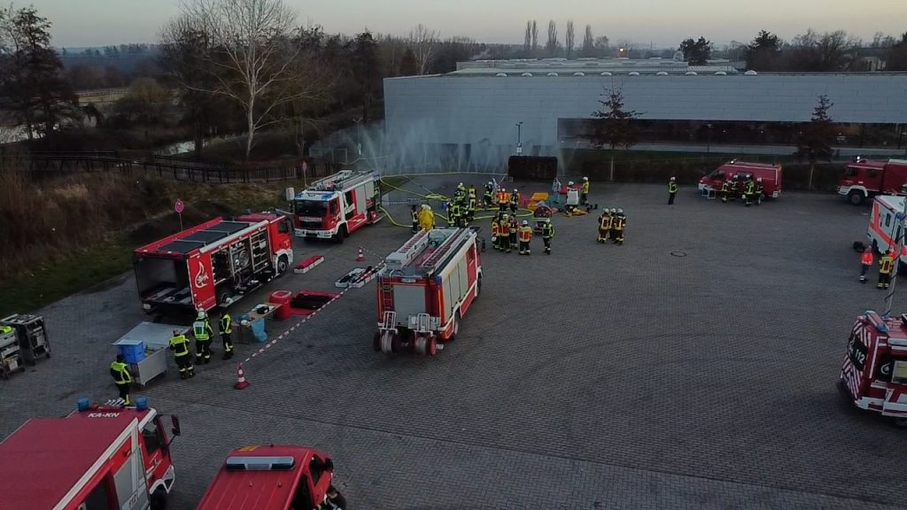 Einsatzkräfte des Gefahrstoffzugs rüsteten sich mit Vollschutzanzügen aus, gingen zur vermuteten Leckage in der Chlorgasanlage des Hallenbades vor und stoppten den weiteren Austritt. Zur Rückhaltung des bereits ausgetretenen Gases richteten die Feuerwehrleute mit einem Düsenschlauch einen Wasserschleier ein. Diese Maßnahme verhindert, dass Chlorgas ungehindert in die Atmosphäre gelangen kann.