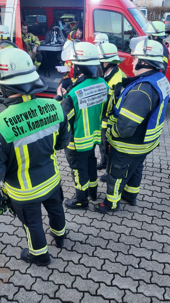 Unter der Leitung von Einheitsführer Michael Jörger aus Karlsdorf-Neuthard waren 42 Angehörige dieser Spezialeinheit für Gefahrstoffe in Stutensee im Einsatz. Der Zug setzt sich aus Kräften der Feuerwehren Karlsdorf-Neuthard, Kraichtal, Bretten und Kürnbach zusammen und trifft mit den Spezialfahrzeugen direkt am jeweiligen Schadensort ein. Ausgelöst wurde der Einsatz durch die automatische Chlorgasmeldeanlage.