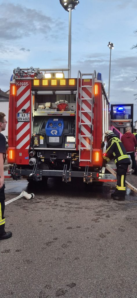 Zunächst startete die Jugendfeuerwehr Karlsdorf-Neuthard das Übungsszenario gegen 16 Uhr und rückte mit drei Fahrzeugen zur Einsatzstelle an. Hier wurde ein Brand am Gebäude angenommen. Parallel wurde die Wasserversorgung vom nahegelegenen Überflurhydrant zum Löschfahrzeug sowie die Angriffsleitungen zur Bekämpfung des Feuers aufgebaut. Hierbei sicherte die Jugend, dass das Feuer sich nicht auf weitere Gebäudeteile ausgedehnt hat.
